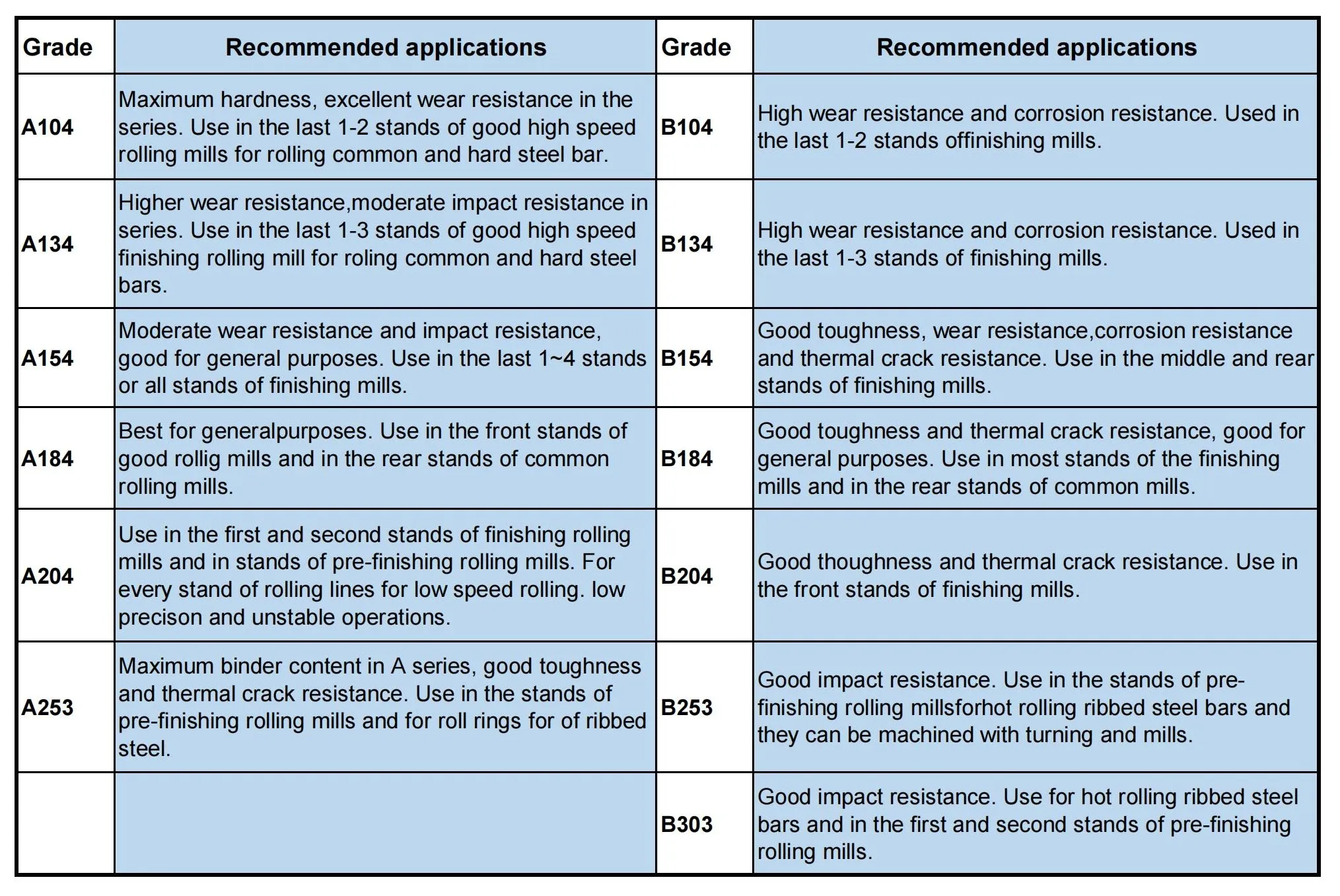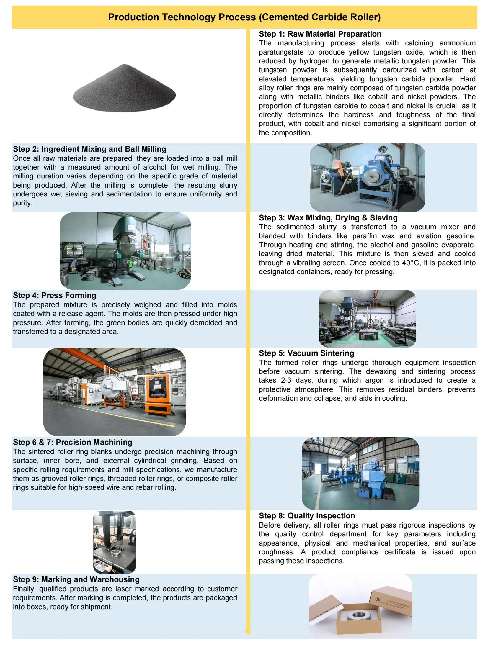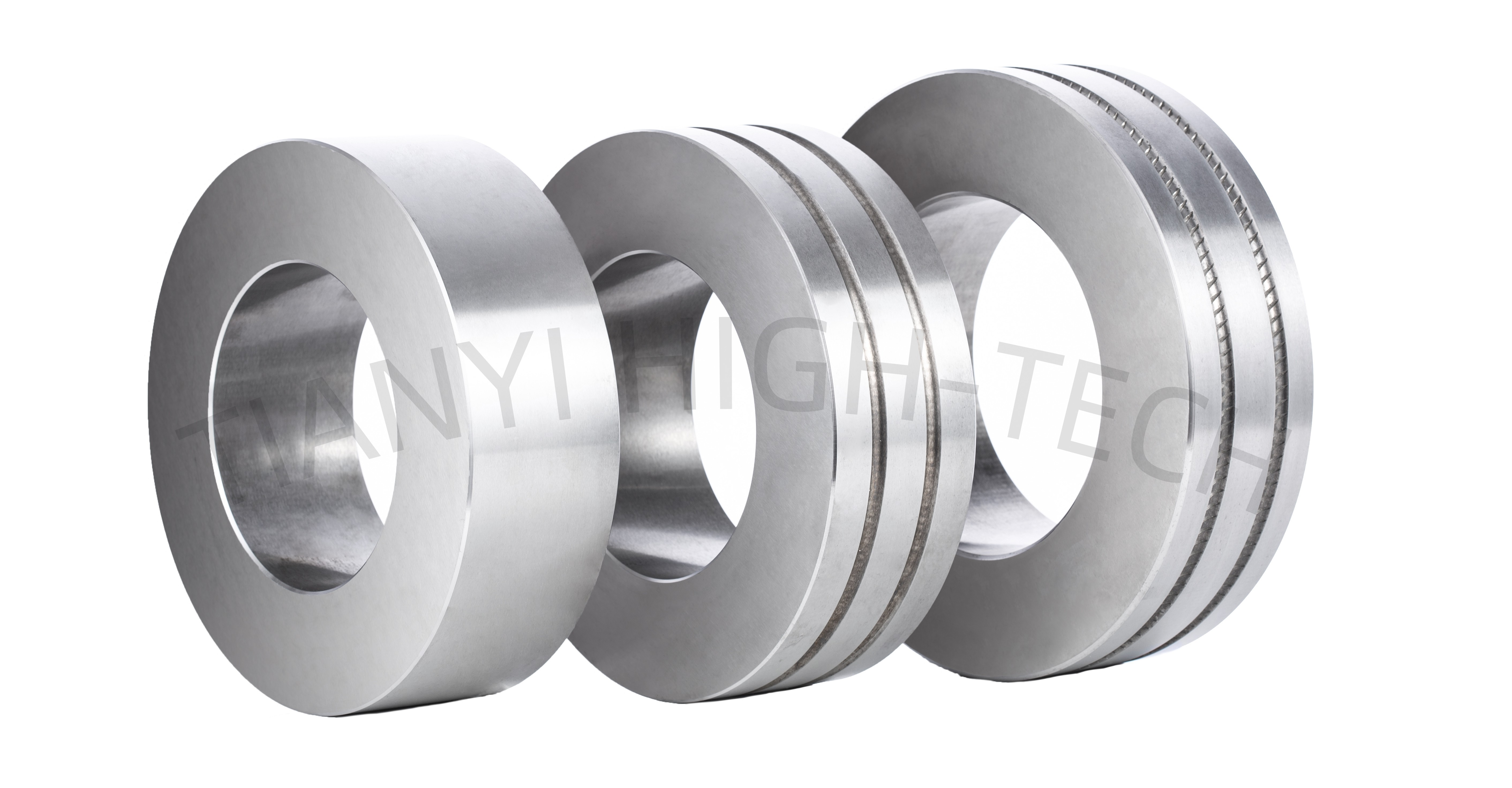 Os anéis de rolo de metal duro (também conhecidos como anéis de rolo de carboneto de tungstênio) oferecem excelente condutividade térmica e superam os rolos de ferro fundido de primeira geração e aço rápido em termos de resistência ao calor, resistência ao desgaste e resistência, com redução mínima de dureza em altas temperaturas. Desenvolvidos juntamente com laminadores de fio-máquina de alta velocidade, eles agora são amplamente aplicados em bancadas de acabamento para fabricação de fio de alta velocidade, vergalhões e barras de aço deformadas.